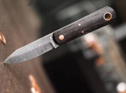 The handle of the BFF is so universally shaped that both small and somewhat larger hands can easily find room here. Only if you have exceptionally large paws, it could possibly be tight here. The bog oak wood gives a great visual contrast to the copper pins. If you want to attach a bead, you can do so thanks to the large hollow rivet at the end of the handle.