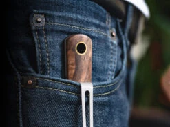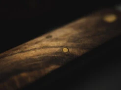 The handle of the BFF is so universally shaped that both small and somewhat larger hands can easily find room here. Only if you have exceptionally large paws, it could possibly be tight here. The walnut wood gives a great visual contrast to the brass pins. If you want to attach a bead, you can do so thanks to the large hollow rivet at the end of the handle.