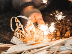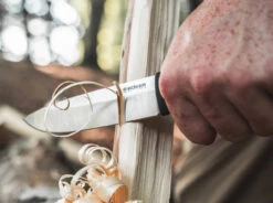 The blade was nevertheless ground so thin that in addition to the stability also very good cutting properties are given. At the front part of the blade back was ground an extremely sharp-edged 90 degree angle, with which you can effortlessly scribe the supplied fire steel.