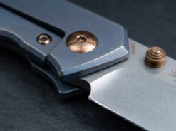 S35VN steel with a stonewashed finish, blue anodized titanium handle scales with bronze accents, and a copper thumb stud.