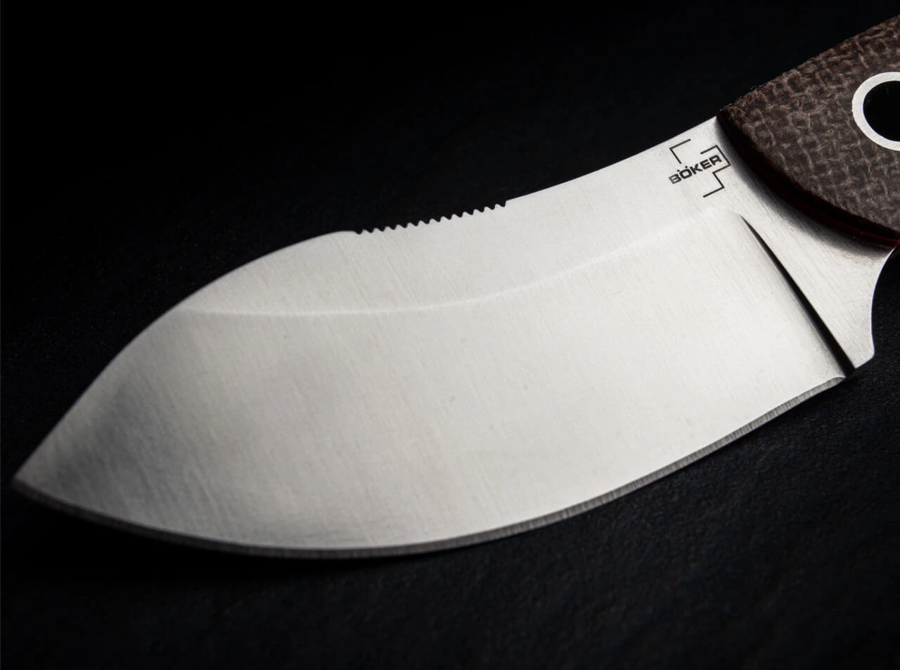 This full tang knife is made of solid D2 steel, which is considered to be extremely tough, durable and keeps the cutting edge sharp for a long time. Following the tradition of the classic Nessmuk knives, the blade has the typical upward sweep and a slight hump on the back of the blade towards the tip. This serves to make the tip of the knife a little easier to guide during hunting applications.