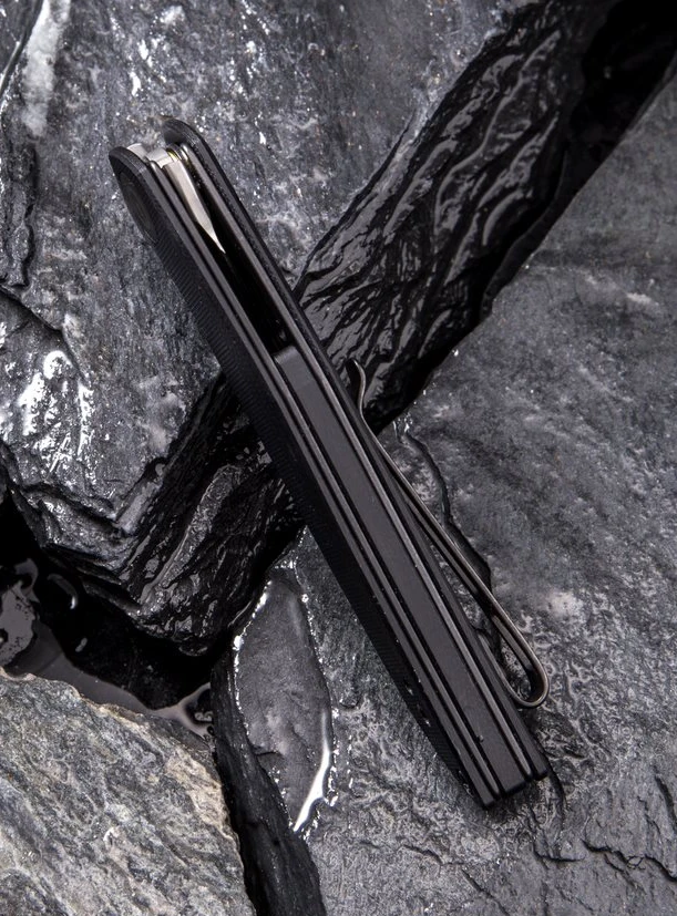 When you see the McKenna open, you’re sure to notice what makes this Isham design stand out: the continuous, flowing line with which the linerlock-secured blade transitions into the handle is simply beautiful. The slim tapered handle features very robust, black G10 scales and a convertible deep-carry clip for a subtle appearance in your pocket.