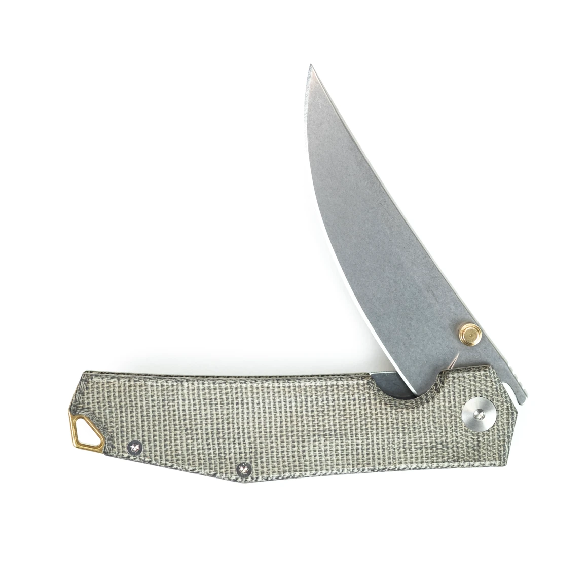The handle is with equipped with green Micarta scales and a brass backspacer/thumb pin, which gives the knife a certain old-school charm and looks simply fabulous. The shape of the handle may remind you a bit of the classic Scandinavian Pukkos, but without copying them. The slightly sloping shape towards the back offers a great hand position, which makes this compact pocket knife very universal. Thanks to the generous recess in the handle, the liner lock is easy to unlock and very easy to use.
