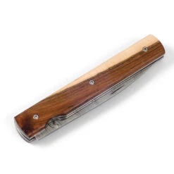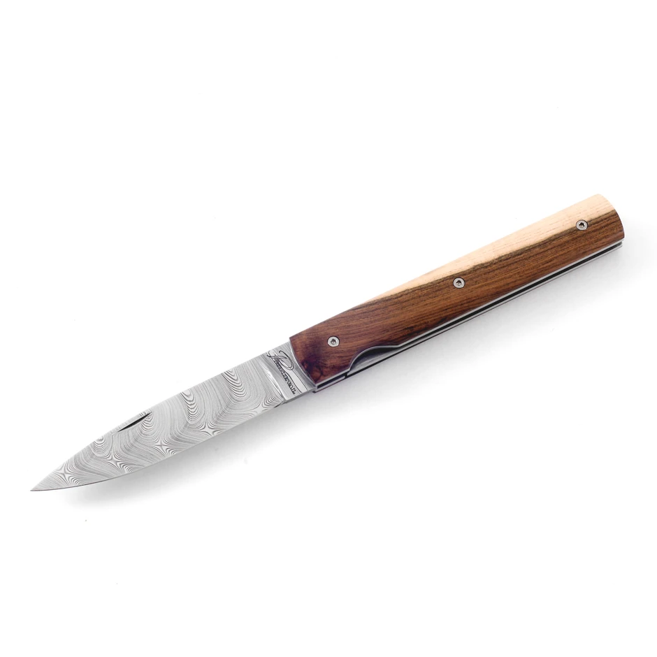 Perceval is based in Thiers France and has been making elegant pocket knives for everyday use or collecting since 1995. As with the classic version of the Les Francais (i.e. without the Damascus blade), the inspiration comes from a 17th century knife. This knife combines the practicality of a knife with the elegance of selected woods and the braided twist damascus.