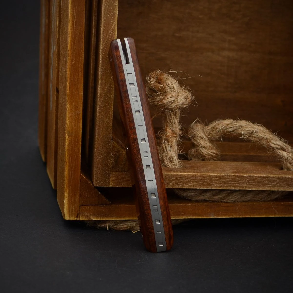 In direct comparison to the L08 or the Le Francais, it is noticeable that the Le Thiers is a little larger, curvier and more elegant. The liner lock closes the knife very cleanly and can be unlocked easily with one hand. Really great is the guilloche on the back of the knife, which we already know from the classic Laguiole knives. These here very modern executed decorations reinterpret the classic file work and still give the knife a traditional touch. The handle wood in this variant is made of Amourette – a wood that radiates an incredible warmth and is also very robust.