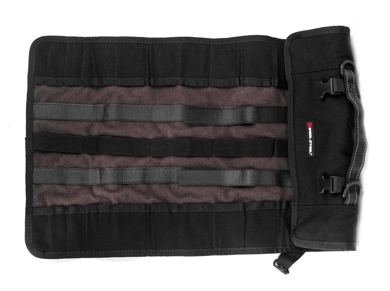The roll bag made of soft nylon offers ample space for up to 20 pocket knives. Thanks to the Velcro straps and loops attached to the inside, the knives do not run the risk of slipping.