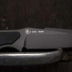 From a purely visual standpoint, this knife is also based on classic American fighter designs,although the design signature of Spartan chief Curtis Lovito cannot be overlooked. The thumb rampand the very long swedge, in conjunction with the PVD coating, give the Phirke a tacticool look.