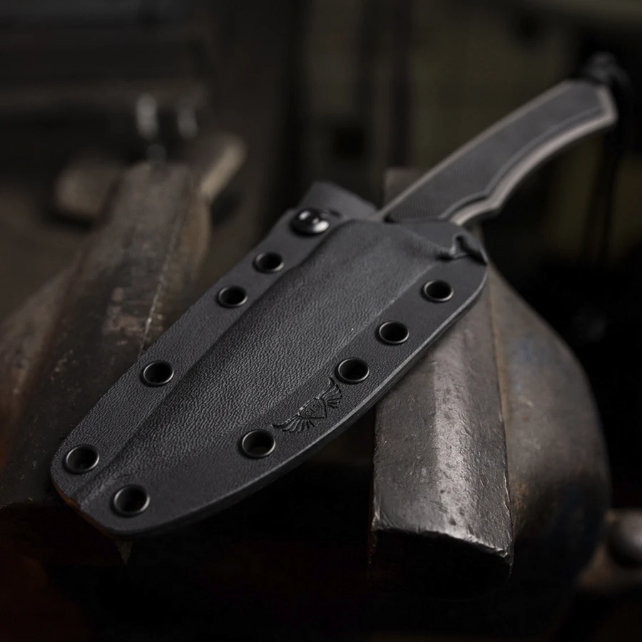 - Version Black / Black: blade PVD coated black, handle scales black G10, Kydex black