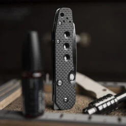 This knife’s lightweight, skeletonized handle features full stainless steel liners, textured carbon fiber/G-10 laminate scales and a reversible, tip-up pocket clip for ambidextrous comfort. The “speedholes” give the handle a modern shape that fits universally.
