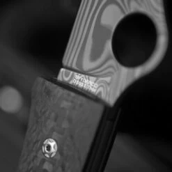 This exceptional material was developed by the Swedish company Damasteel and is produced in a patented powder metallurgical process in which layers of RWL 34 and PMC 27 are welded together to form a state-of-the-art Damascus stainless steel. After precision machining and flat grinding, the blade is acid etched to reveal the complex layering pattern. Almost as spectacular is the handle of this knife, with its solid carbon fibre scales carefully machined to create ergonomic and curved surfaces.