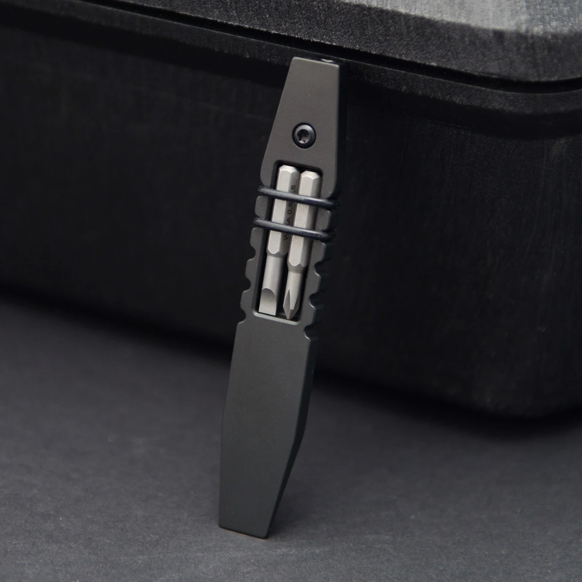Vero Engineering has come up with an extremely well thought-out answer to theese problems in the form of the Fulcrum. The prybar is milled entirely from lightweight titanium, weighs a mere 29 grams and is hardly noticeable in the pocket thanks to the flat clip. The most brilliant thing about the Fulcrum is the possibility of carrying two micro-bits by held by two O-rings, which can be inserted on the top of the clip. baslcially you not only have a pry tool, but also a bit holder at the same time.